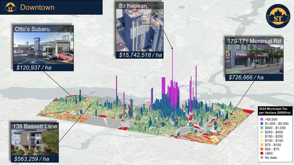 We can zoom in and start appreciating where value is being generated. For example, the city-leading property generates revenue at a rate of $15,000,000 per hectare. We also see how a sidewalk facing strip mall in Rideau-Vanier and a modest 3-story townhome in Kitchissippi outperform a car dealership by several factors.