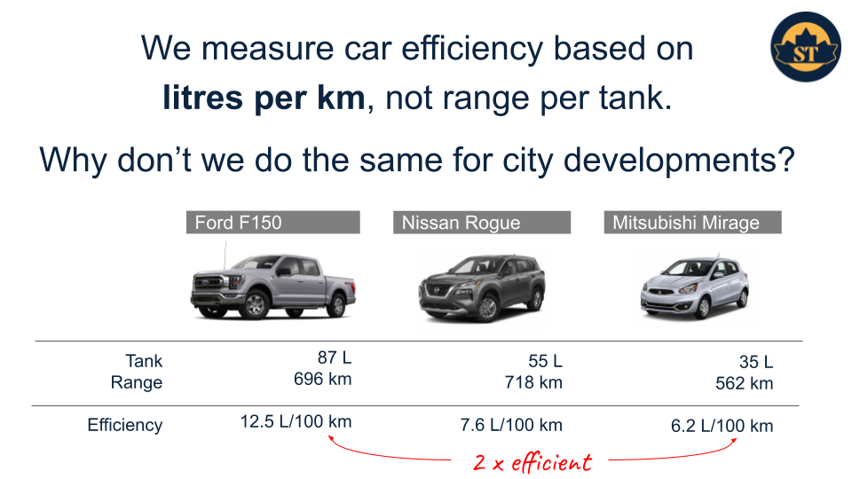 This is what we refer to as “tax revenue density”. You divide the amount of tax a property generates by its area. At scale, this type of metric is useful to show development patterns that are efficient at building wealth for the city, and which are less productive. The same way we can compare fuel efficiency of cars, dividing the tax bill by area permits apples-to-apples comparisons between properties. Large format properties are no longer favoured just because they are big.