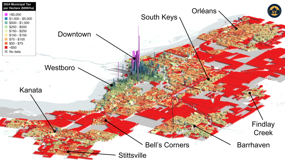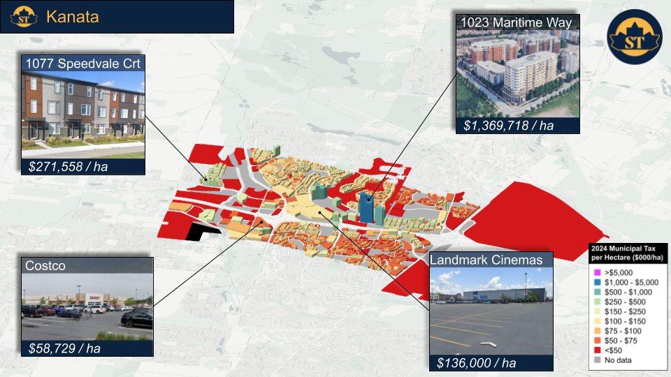 Tax revenue maps typically report the overall tax levy on a property in dollars. This approach favours large format developments but hides how efficiently it’s generating municipal revenues. Efficiency matters!