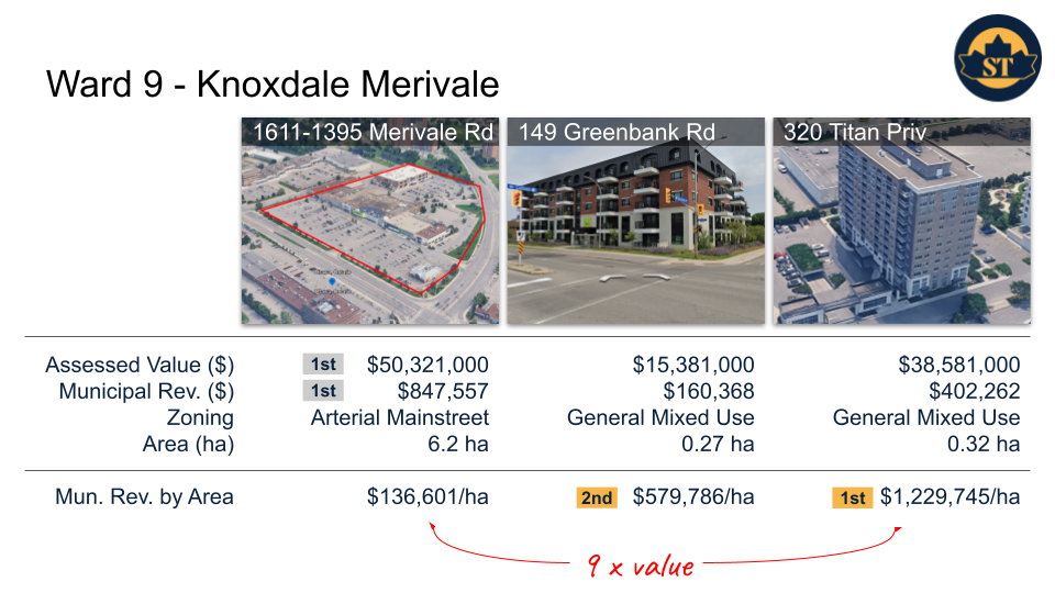 In Ward 9 Knoxdale-Merivale, the property with the highest assessed value is a huge lot with multiple big box stores, a fast-food restaurant, and a gym. This property also pays the highest amount of municipal taxes. However, when you account for how much space it takes up, mostly for parking, it generates slightly over $130,000 per hectare. By comparison, the two most efficient revenue generating properties in the ward generate municipal revenues up to 9 times more efficiently, and people live there!