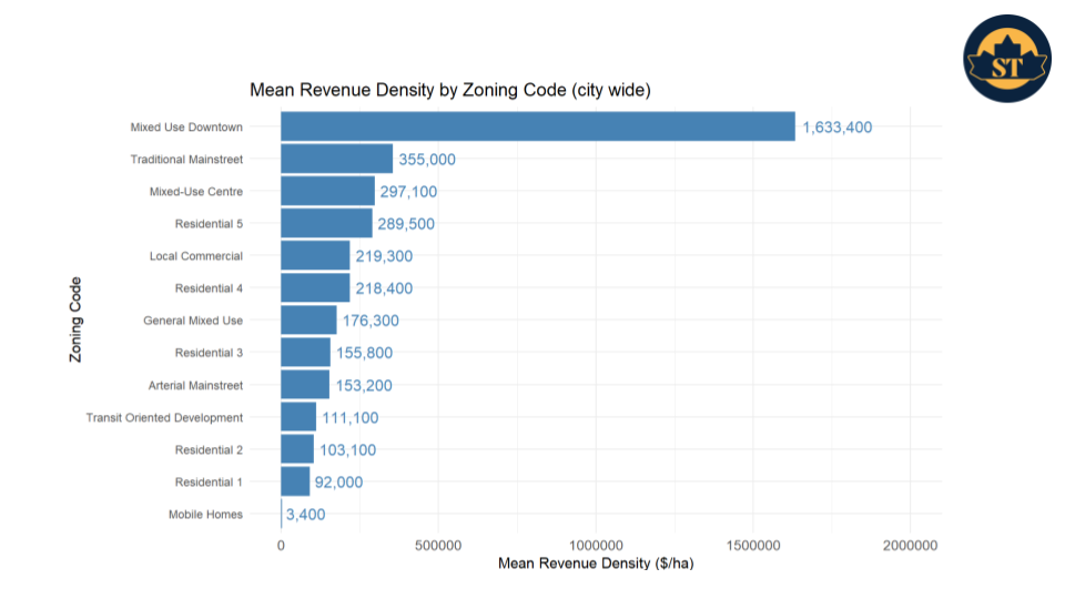 When we look at the city-wide average revenue density by zoning group we see how efficient Mixed-Use Downtown properties are. At the bottom, we find R1, R2, Arterial Mainstreet and oddly Transit Oriented Development (maybe it just needs more time? We’ll look at this in a future post).