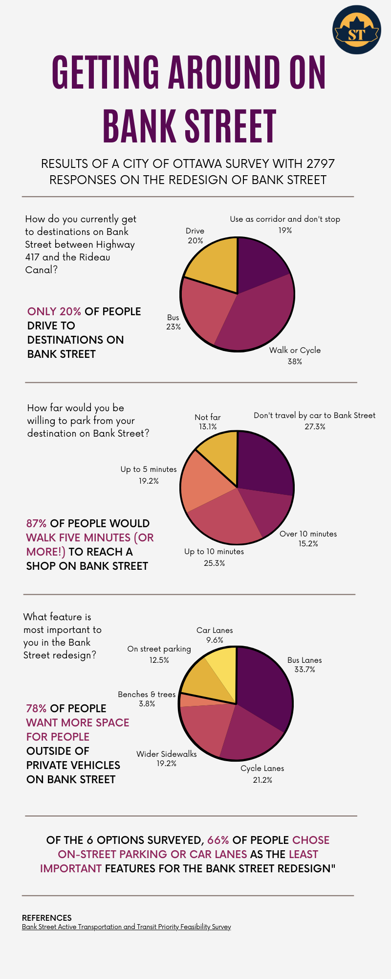 - The majority of respondents (80%), arrive to Bank outside of a personal vehicle (walking, cycling, transit, etc...), or don't actually stop along Bank